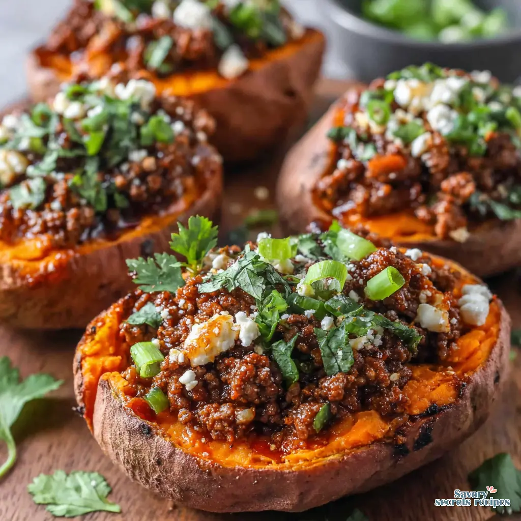 - Scoop a small portion from the roasted sweet potatoes to create boats, then fill with the beef mixture.