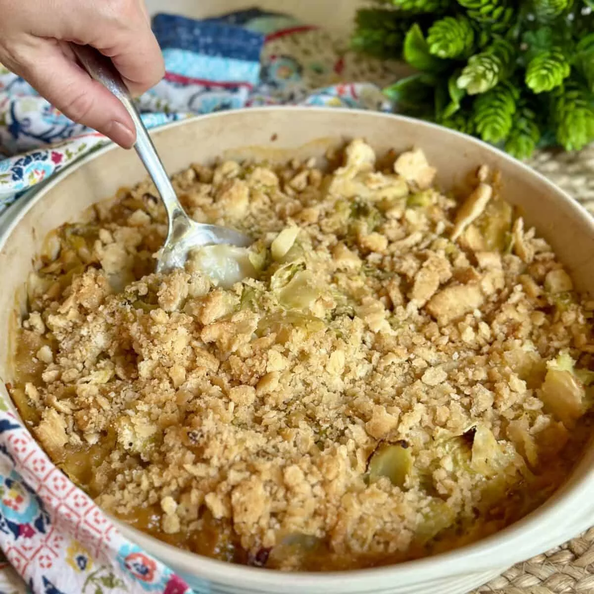 - Melt the remaining 4 tablespoons of butter in a small bowl. Mix the melted butter with the crushed crackers. Evenly sprinkle the mixture over the casserole top.