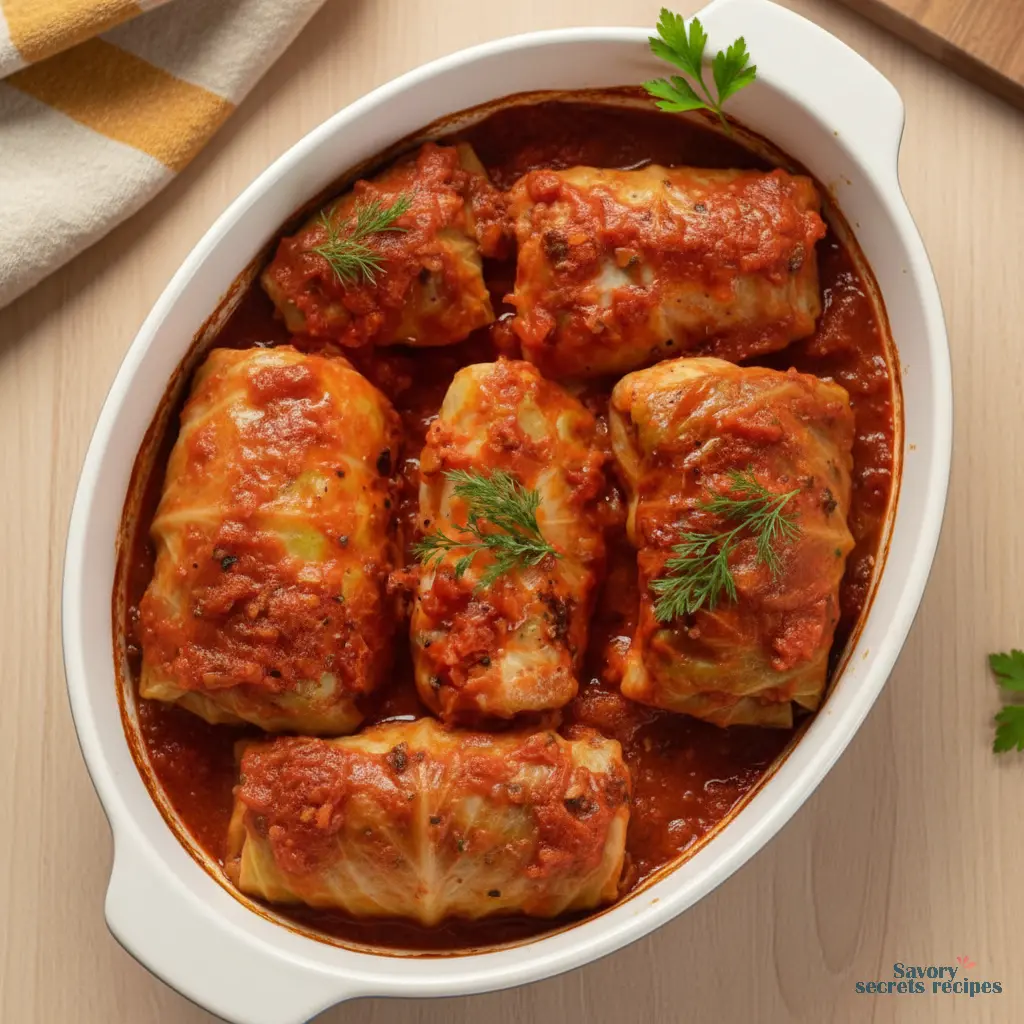 - Coat the bottom of a large baking dish with a thin layer of tomato sauce. Place the stuffed cabbage rolls in the dish with the seams facing down.