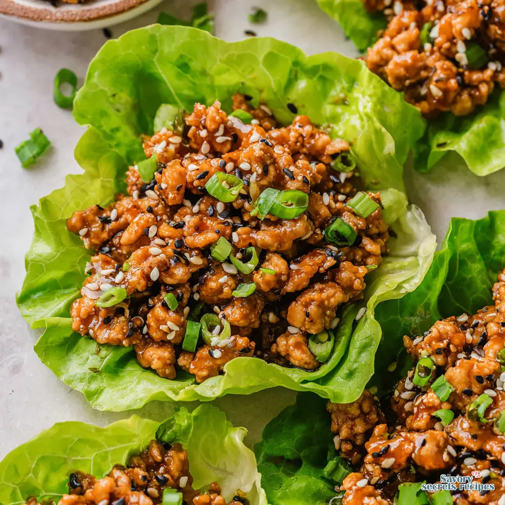 - Spoon the chicken mixture into the lettuce cups. Garnish with sesame seeds and chopped green onions, if desired. Serve immediately.