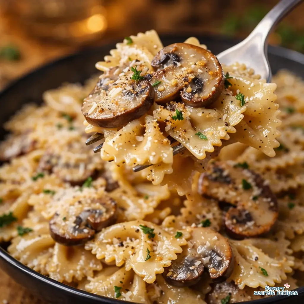 4. Add 12 ounces of farfalle pasta and stir gently to coat each piece in the mushroom mixture.