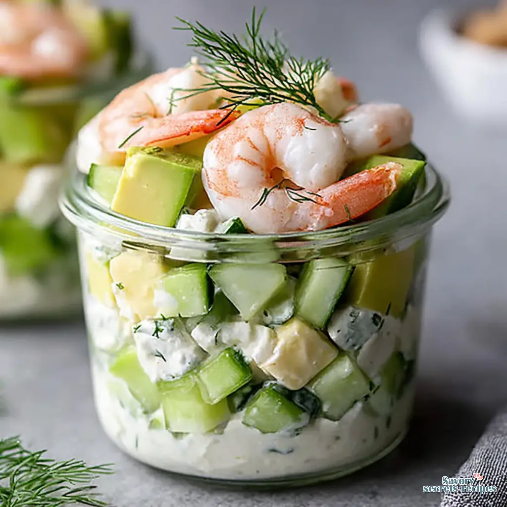 This is where it gets good. The mason jar layering technique. You want crisp vegetables and perfectly preserved avocado when you finally sit down to eat. Put your creamy dressing at the very bottom of the jar. Add a thick celery crunch layer right on top of the dressing to create a barrier. Then add your cold shrimp. Top it with radish slices and fresh cilantro.