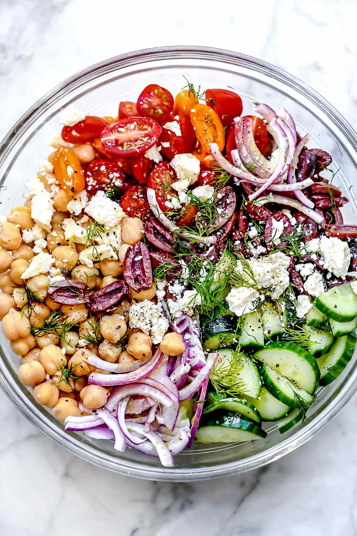 1. In a large bowl, add the drained chickpeas, cucumber, tomatoes, kalamata olives, red onion, half of the feta cheese and the dill.