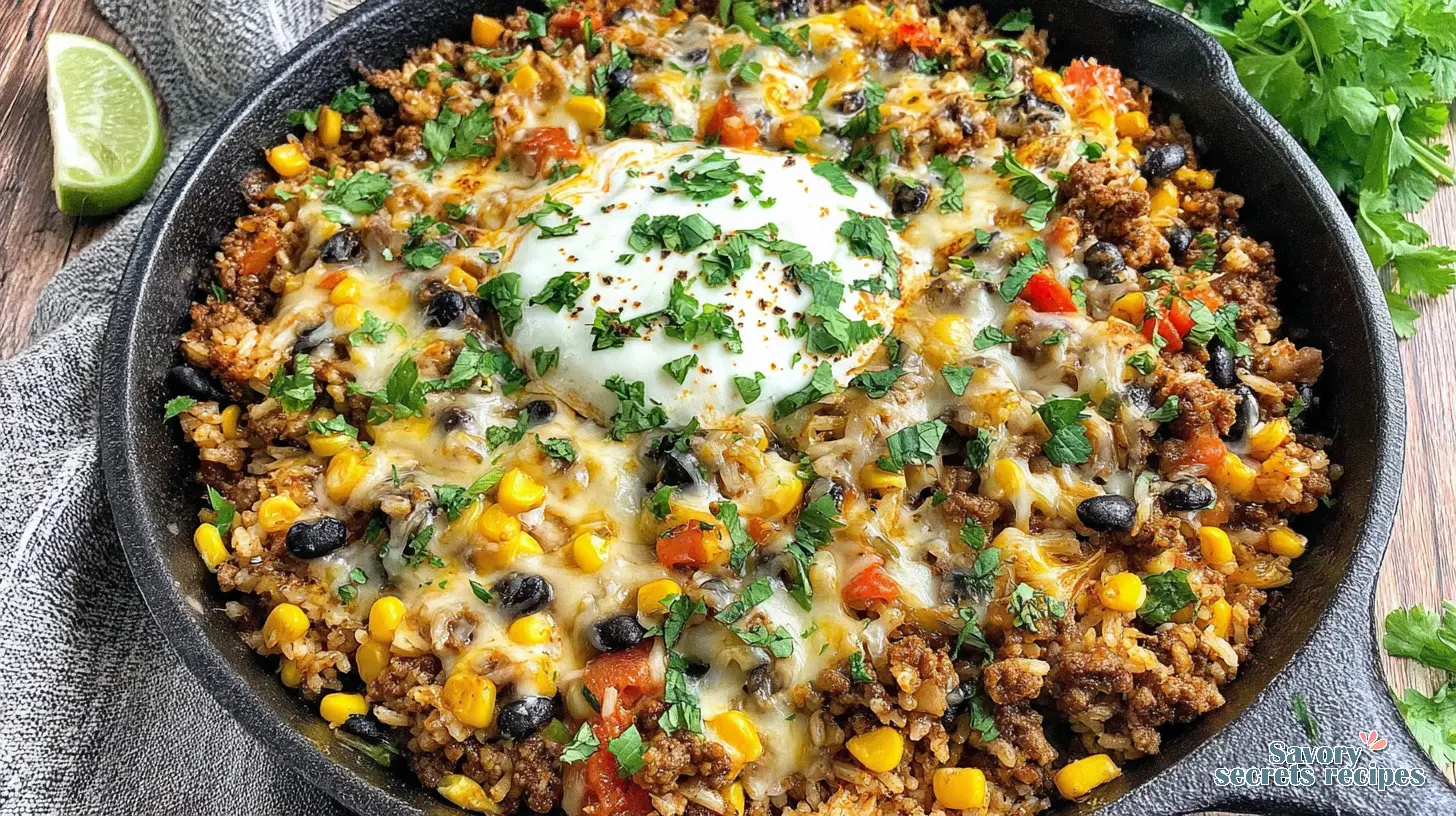 Cheesy Ground Beef Taco Rice Skillet