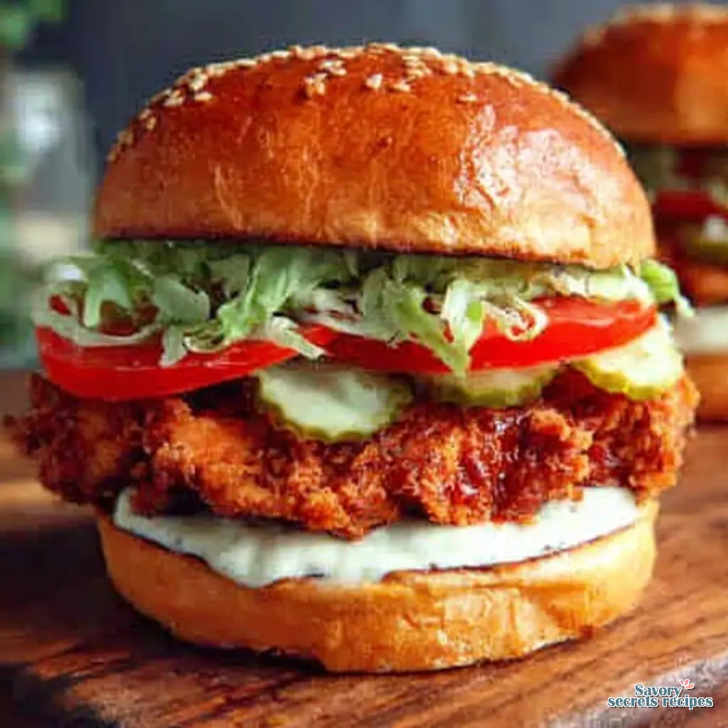 - Build the sandwiches by layering the lettuce, tomato, pickles, spicy mayo, and crispy chicken.