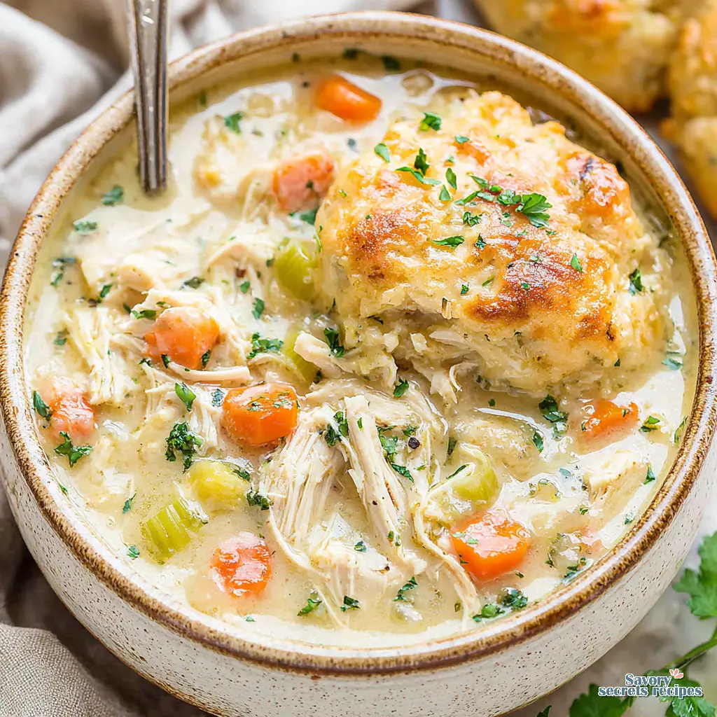 Enjoy creamy chicken pot pie comfort without the crust! This hearty homemade chicken soup is best served with warm, freshly-baked biscuits.