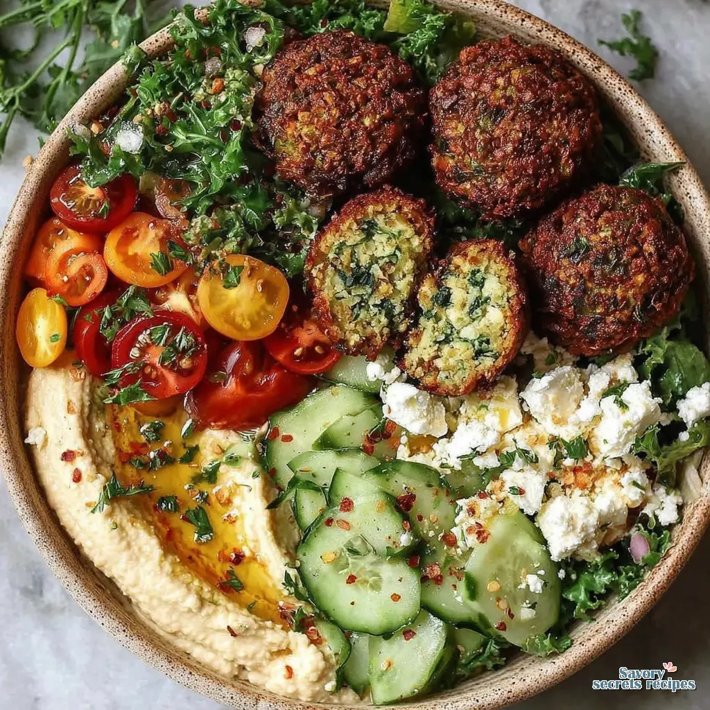 Start with a grain or greens base, add crispy herb falafel, then fresh veggies like cucumber, tomato, and red onion. Creamy hummus, tangy feta, and a lemon tahini dressing tie everything together. It’s a customizable, fresh veggie meal.