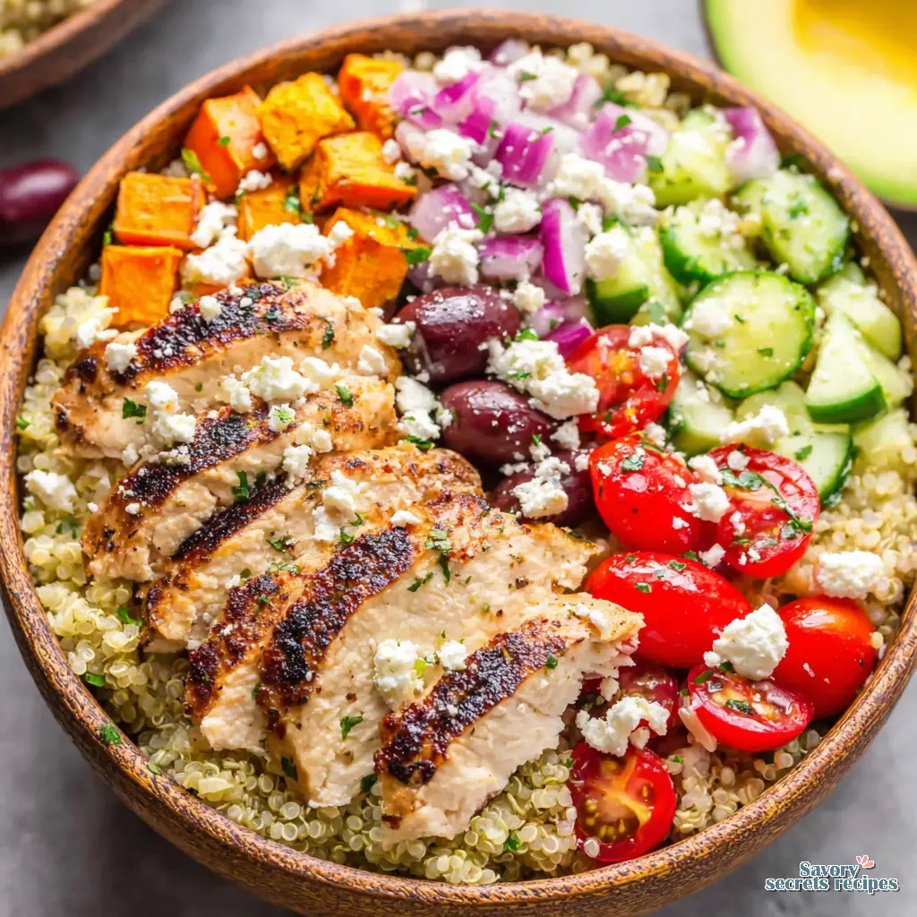 5. Divide the quinoa among four serving bowls. Top with the sliced chicken, cucumber, tomatoes, avocado, red onion, feta cheese, and Kalamata olives. Serve as is or with Greek yogurt or Tzatziki sauce.