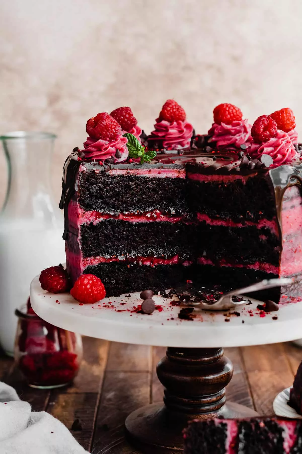 Raspberry Chocolate Layer Cake fully decorated on a stand