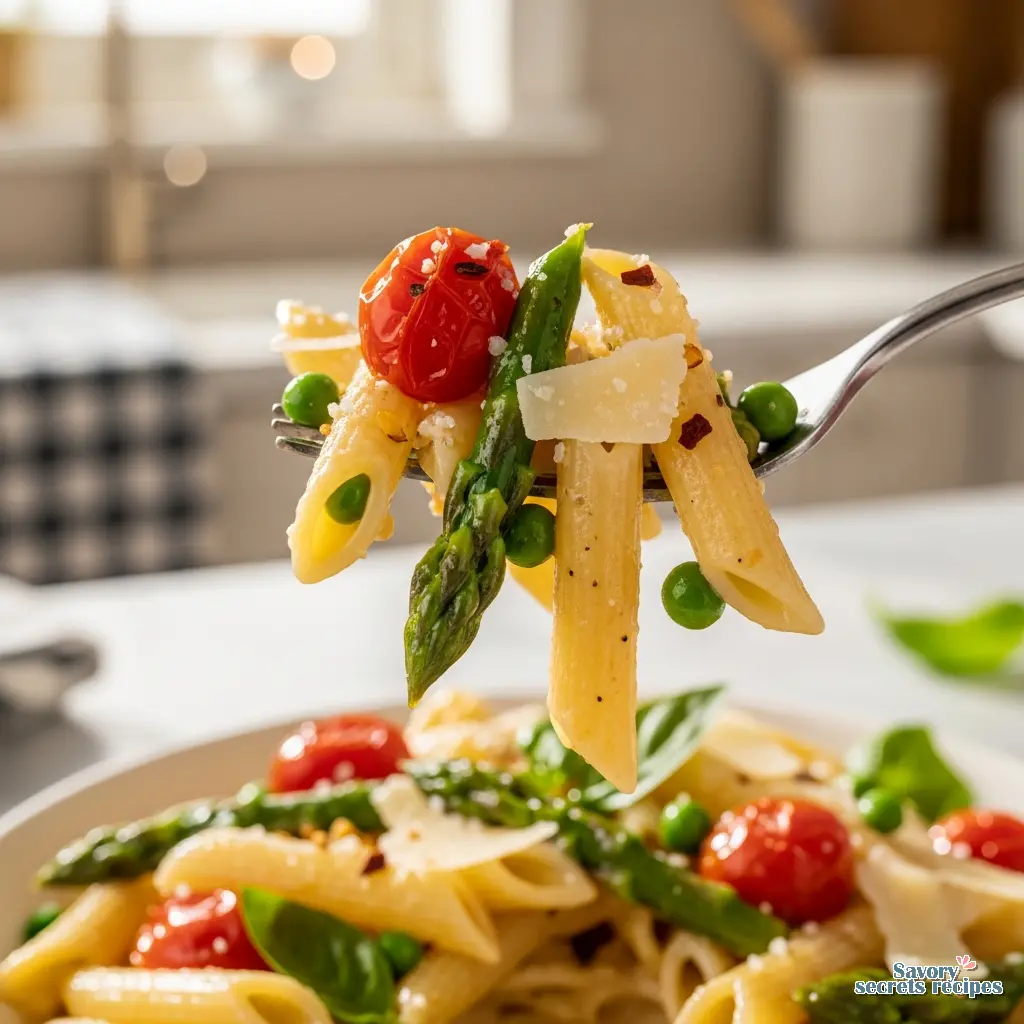 I know weeknights get chaotic. You’re tired. I’m tired. But this is a 20-minute weeknight victory that actually makes you feel like a professional chef. When you toss sweet peas and crisp asparagus spears with a bright, zesty sauce, it’s just pure magic. The satisfying clink of the pasta tongs against a ceramic bowl is my favorite sound this time of year. Your kitchen fills with the scent of fresh basil and garlic. Perfect. Let’s talk about the techniques that make this vegetarian spring pasta recipe foolproof.